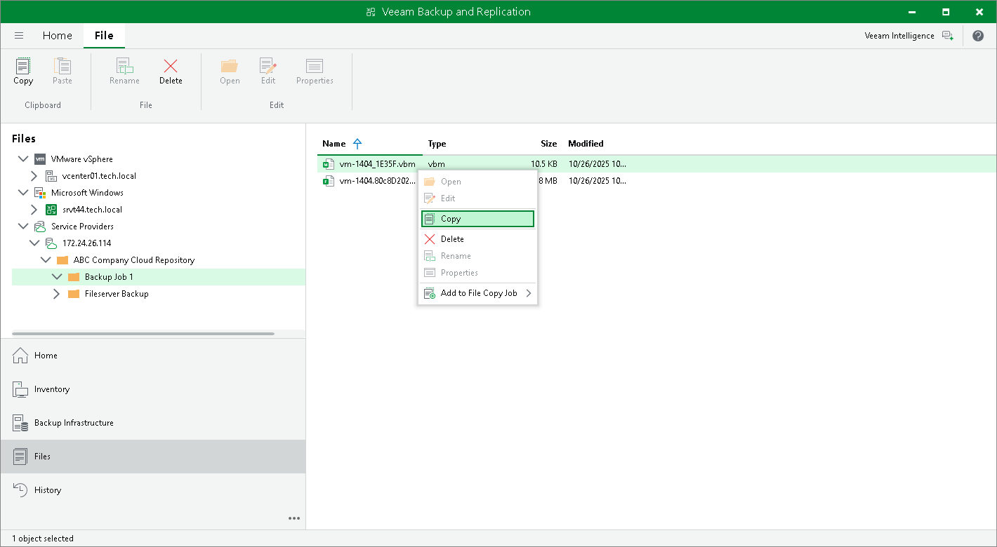 You cannot copy backup files from a cloud repository that uses a scale-out backup repository as a back end. To learn more, see Scale-Out Backup Repositories Used as Cloud Repositories. |