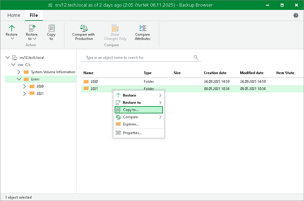 - In the Veeam Backup Browser, Veeam Backup & Replication will display the file system tree of the backed-up machine. Right-click the necessary file or folder and select one of the following options: