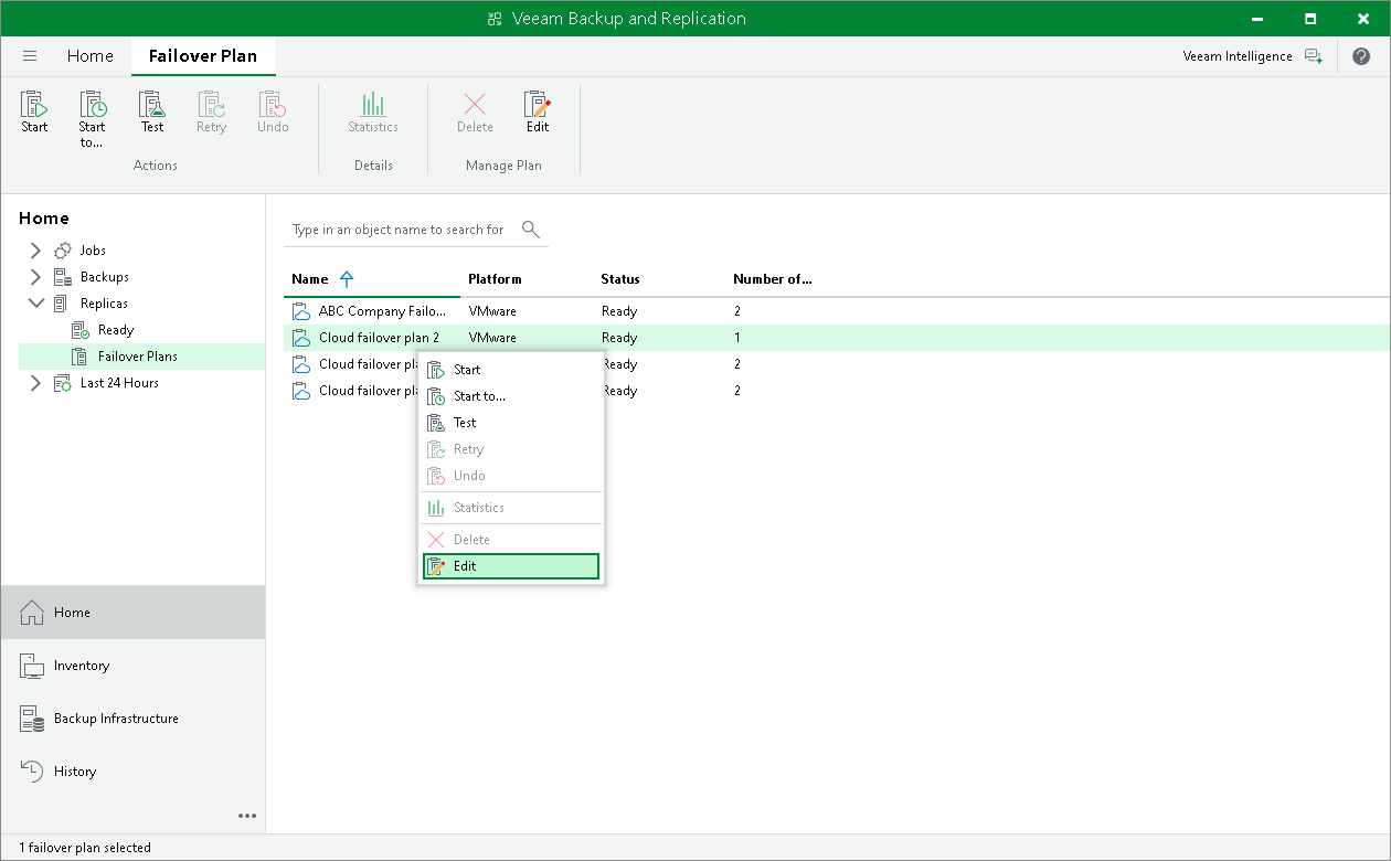 - In the working area, click the necessary cloud failover plan and click Edit on the ribbon or right-click the necessary cloud failover plan and select Edit.