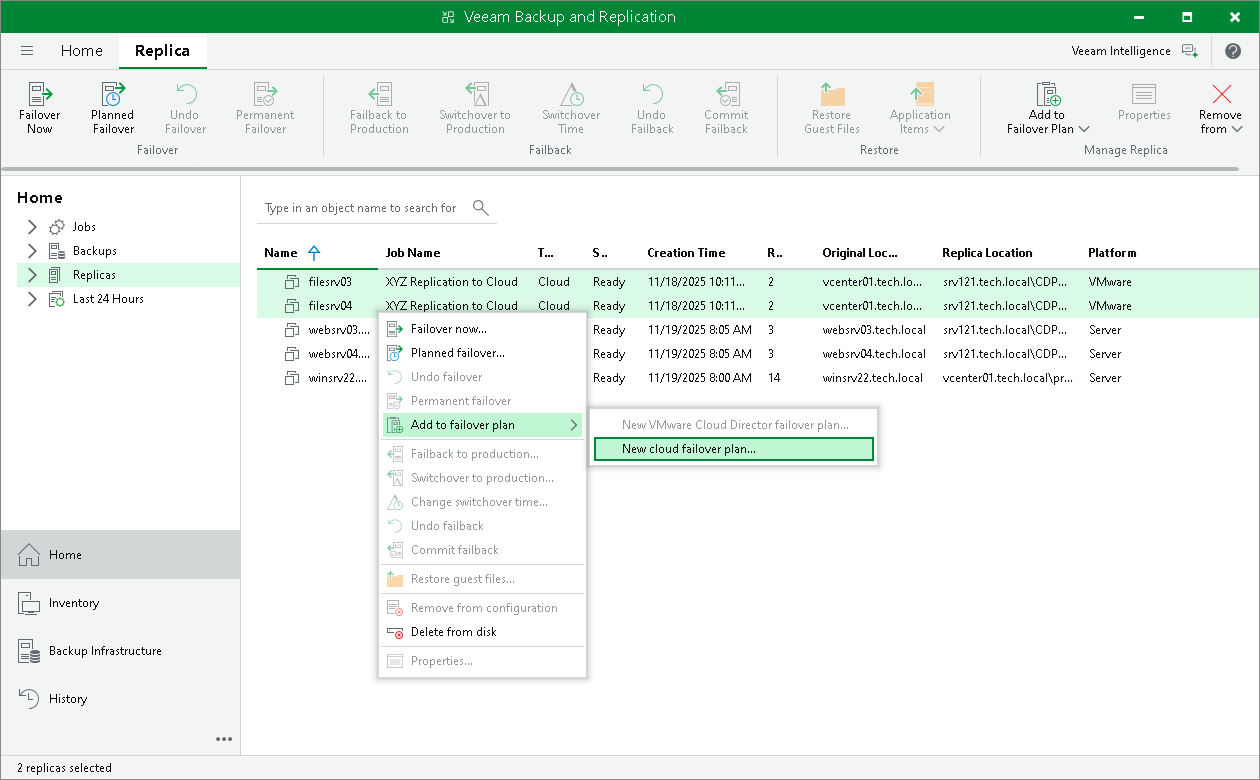- Open the Home view, click the Replicas node in the inventory pane, select one or several VMs in the working area, click Add to Failover Plan > New cloud failover plan on the ribbon or right-click one or several VMs in the working area and select Add to failover plan > New cloud failover plan. In this case, the selected VMs will be automatically included into the failover plan. You can add other VMs to the failover plan when passing through the wizard steps.