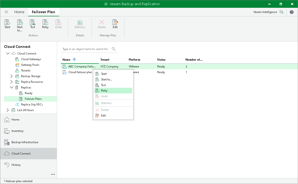 - In the working area, right-click the necessary cloud failover plan and select Retry.