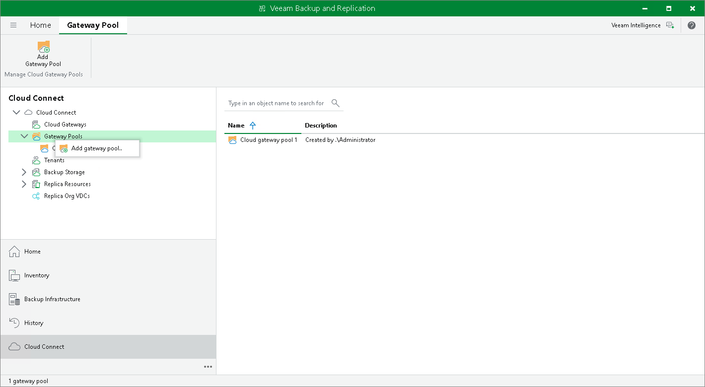 Step 1. Launch New Gateway Pool Wizard To launch the New Gateway Pool wizard, do one of the following:Open the Cloud Connect view. Click the Gateway Pools node in the inventory pane and click Add Gateway Pool on the ribbon.Open the Cloud Connect view. Right-click the Gateway Pools node in the inventory pane and select Add gateway pool.