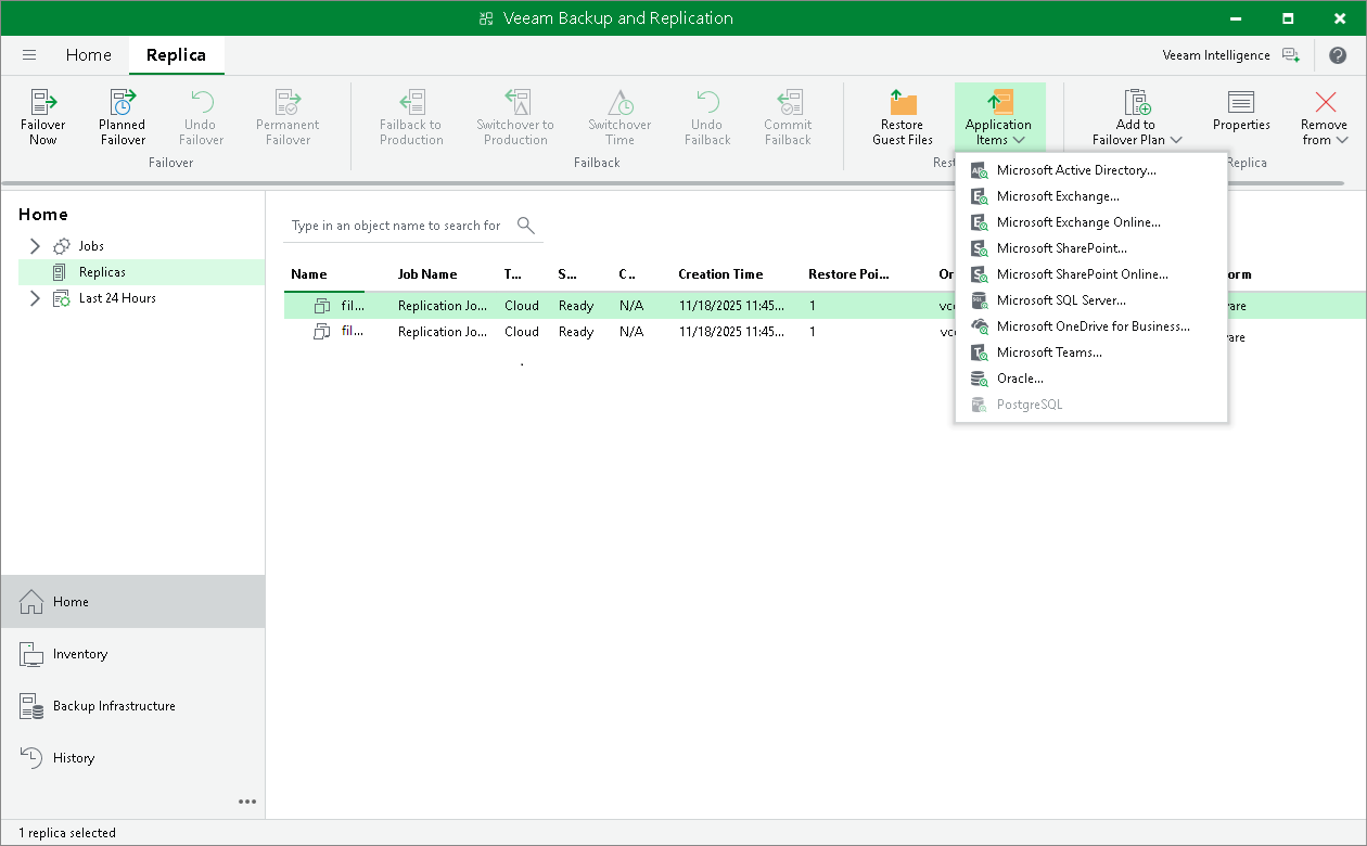 - Open the Home view, in the inventory pane select Replicas. In the working area, select the necessary VM and click Application Items > <Application> on the ribbon.
