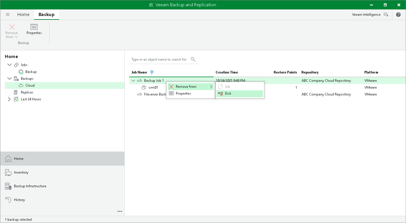 - In the working area, right-click the necessary backup job (or necessary Veeam Agent backup under the Agents node), clik Remove from and select Disk.