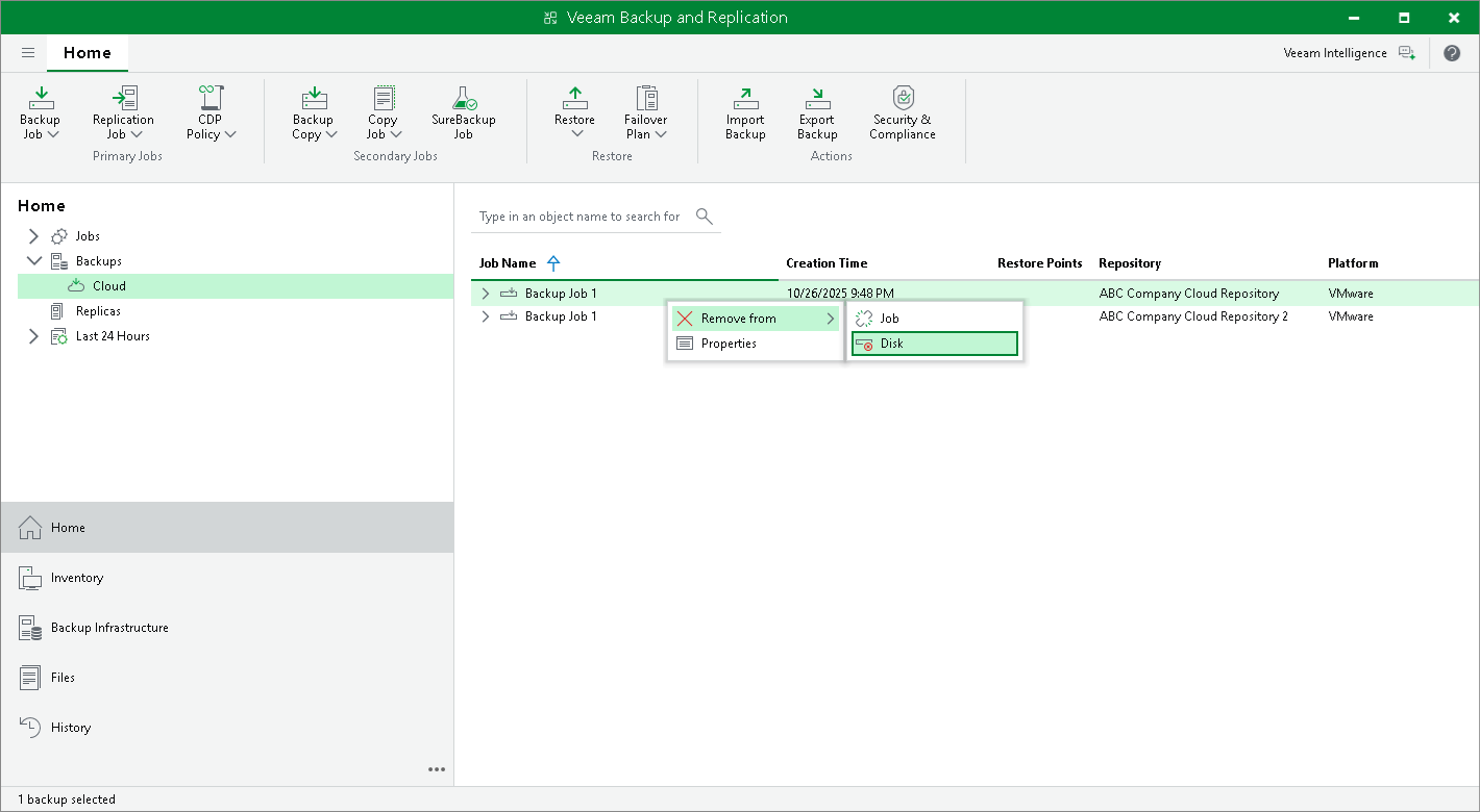- In the working area, right-click the backup job whose backups you want to remove and select Delete from disk.