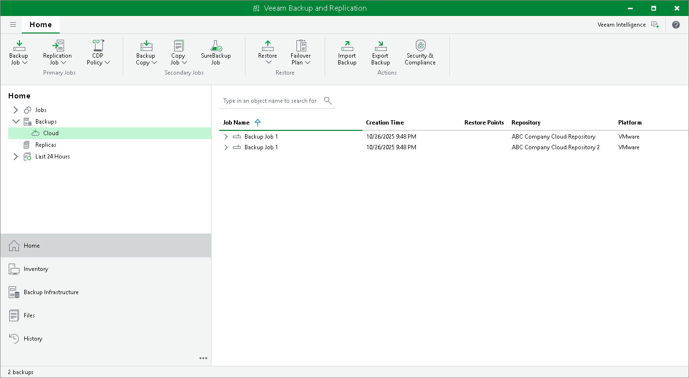 Backups that reside in the new cloud repository will appear in the Home view next to backups that were created in the initial cloud repository.