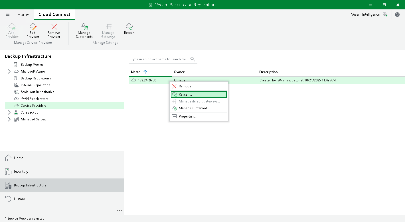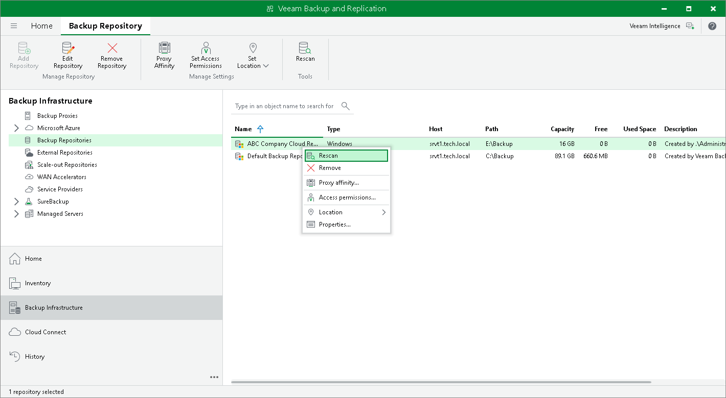- In the working area, right-click the backup repository that is exposed as a new cloud repository and select Rescan.