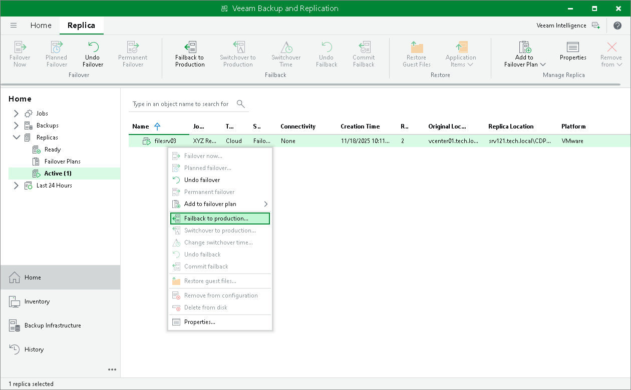- Open the Home view and select the Replicas node. In the working area, select the necessary VM and click Failback to Production on the ribbon.