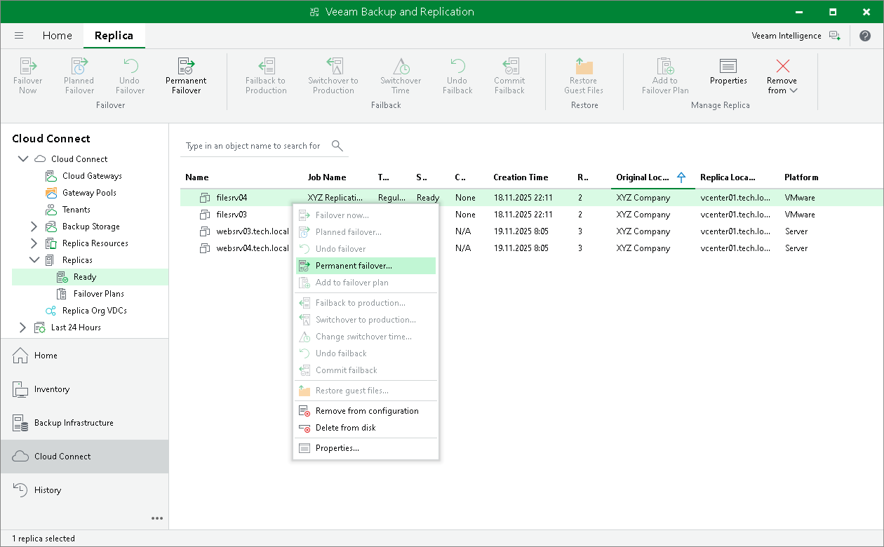 - Open the Cloud Connect view, in the inventory pane select Replicas. In the working area, right-click the necessary VM and select Permanent failover.