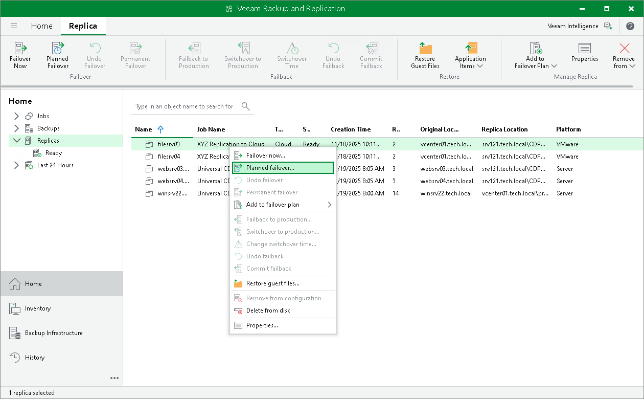 - Open the Home view and select the Replicas node. In the working area, right-click the necessary VM and select Planned failover.