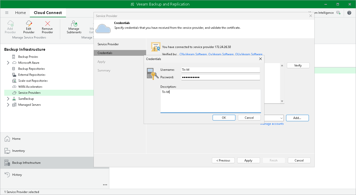 - At the Credentials step of the wizard, click Add next to the Credentials field and specify a new user name and password to connect to the SP. You must specify the password that you used before, unless the SP has changed the password together with the user name.