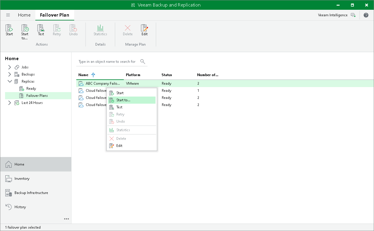 - In the working area, right-click the necessary cloud failover plan and select Start to.
