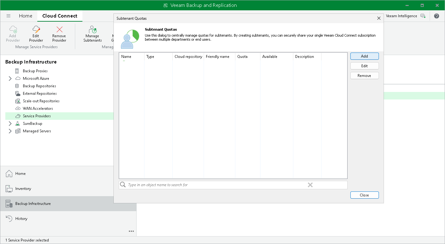 - Open the Backup Infrastructure view. Click the Service Providers node in the inventory pane, select the service provider in the working area and click Manage Subtenants on the ribbon.