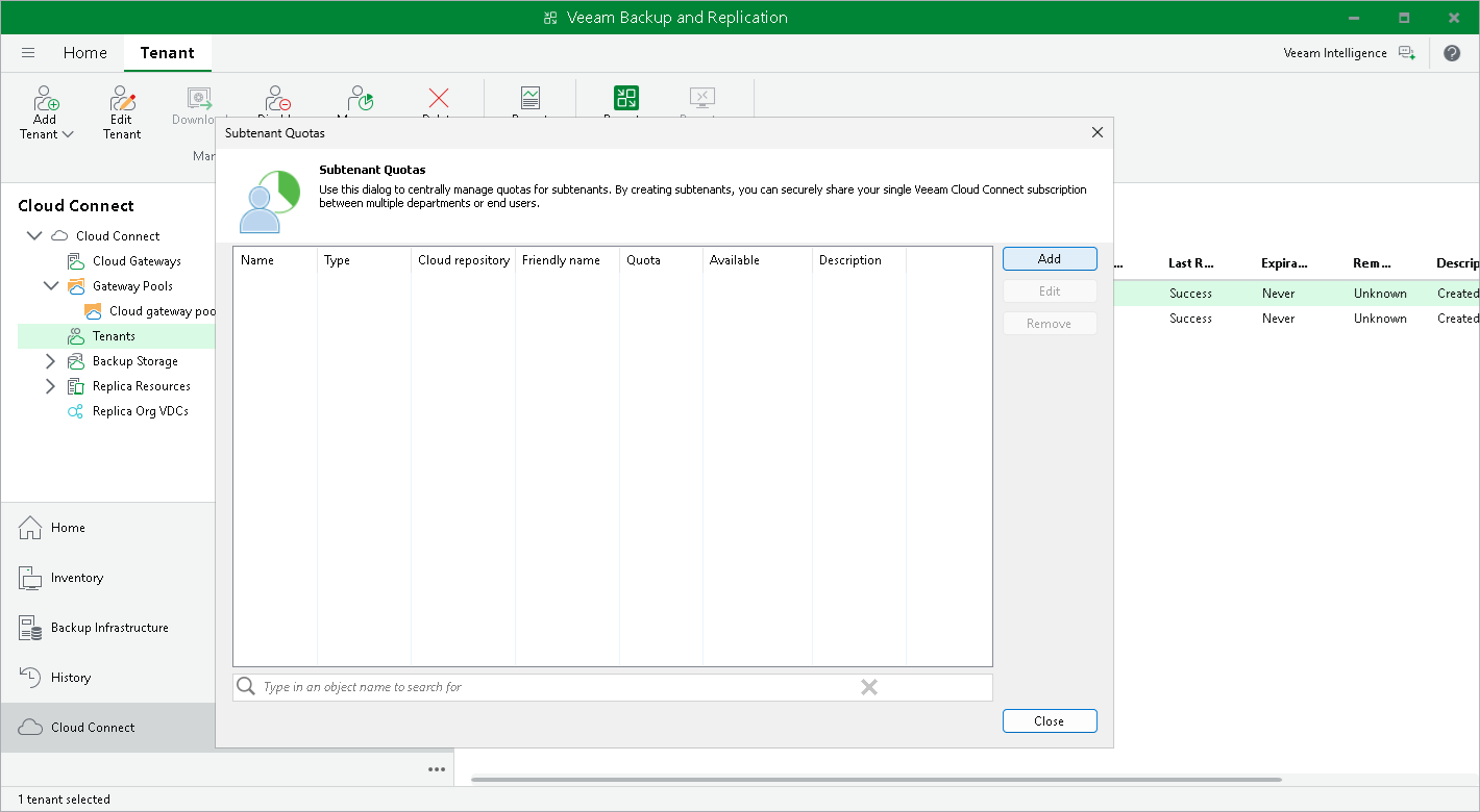 Step 1. Launch New Subtenant Wizard To launch the New Subtenant wizard:Open the Cloud Connect view.In the inventory pane, click the Tenants node.In the working area, select the necessary tenant and click Manage Subtenants on the ribbon or right-click the tenant and select Manage subtenants.In the Subtenant Quotas window, click Add.