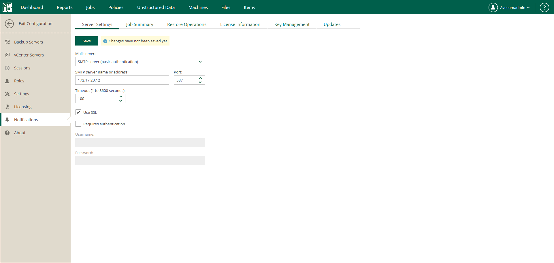 When you add an SMTP server, Veeam Backup Enterprise Manager saves its TLS certificate thumbprint. If the SMTP server certificate is changed and the certificate is not trusted, Enterprise Manager stops sending email notifications until you validate the new certificate. |
