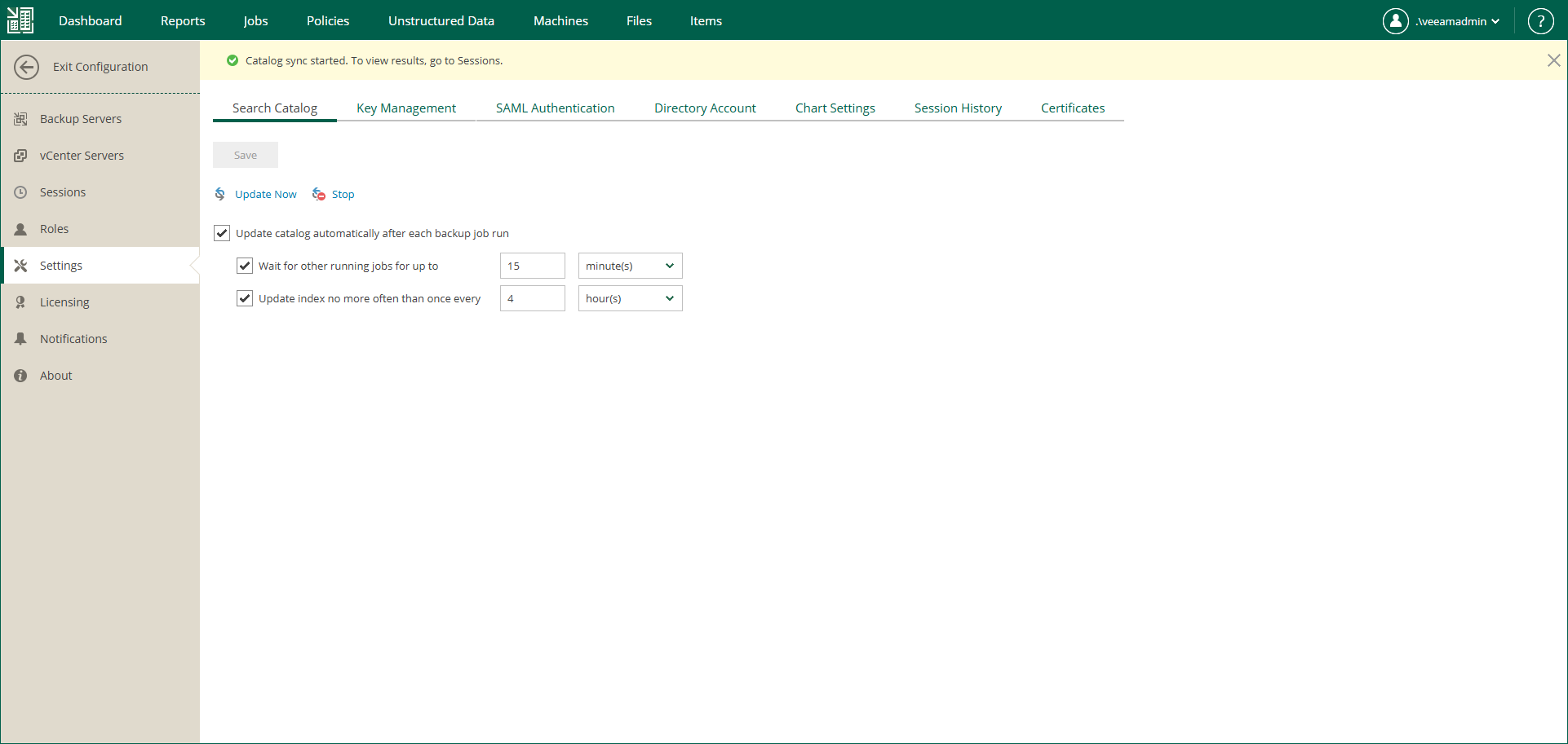 - To automatically run catalog replication after every backup job, open the Settings tab of the Configuration view. On the Search Catalog tab, select Update catalog automatically after each backup job run and specify other options as required.