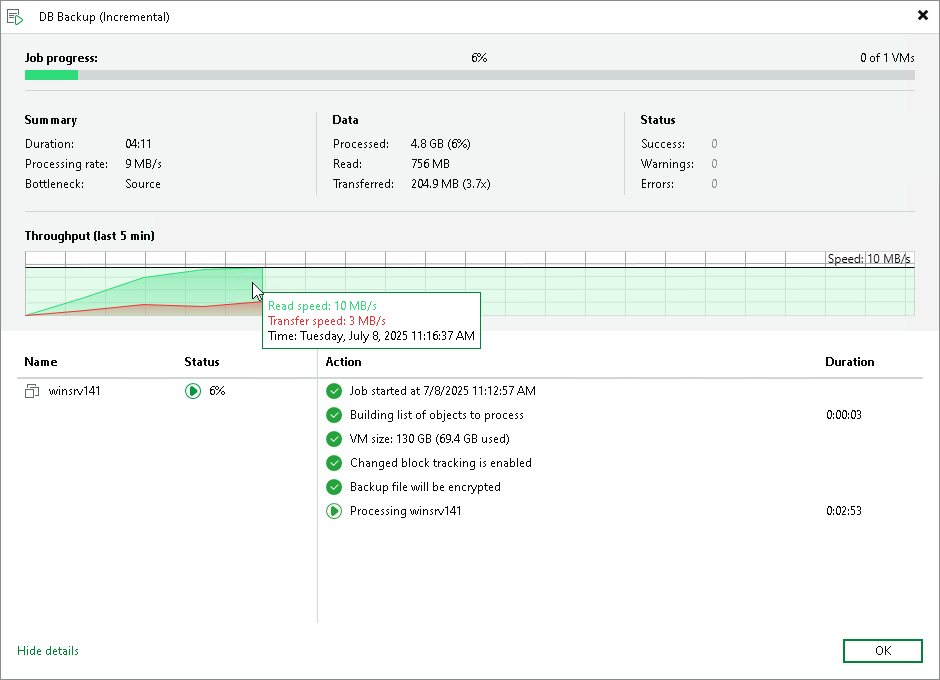 Note that the job must complete with the Success or Warning status. If the job completes with the Failed status, Veeam Backup & Replication does not create the backup file is not able to perform restore operations.