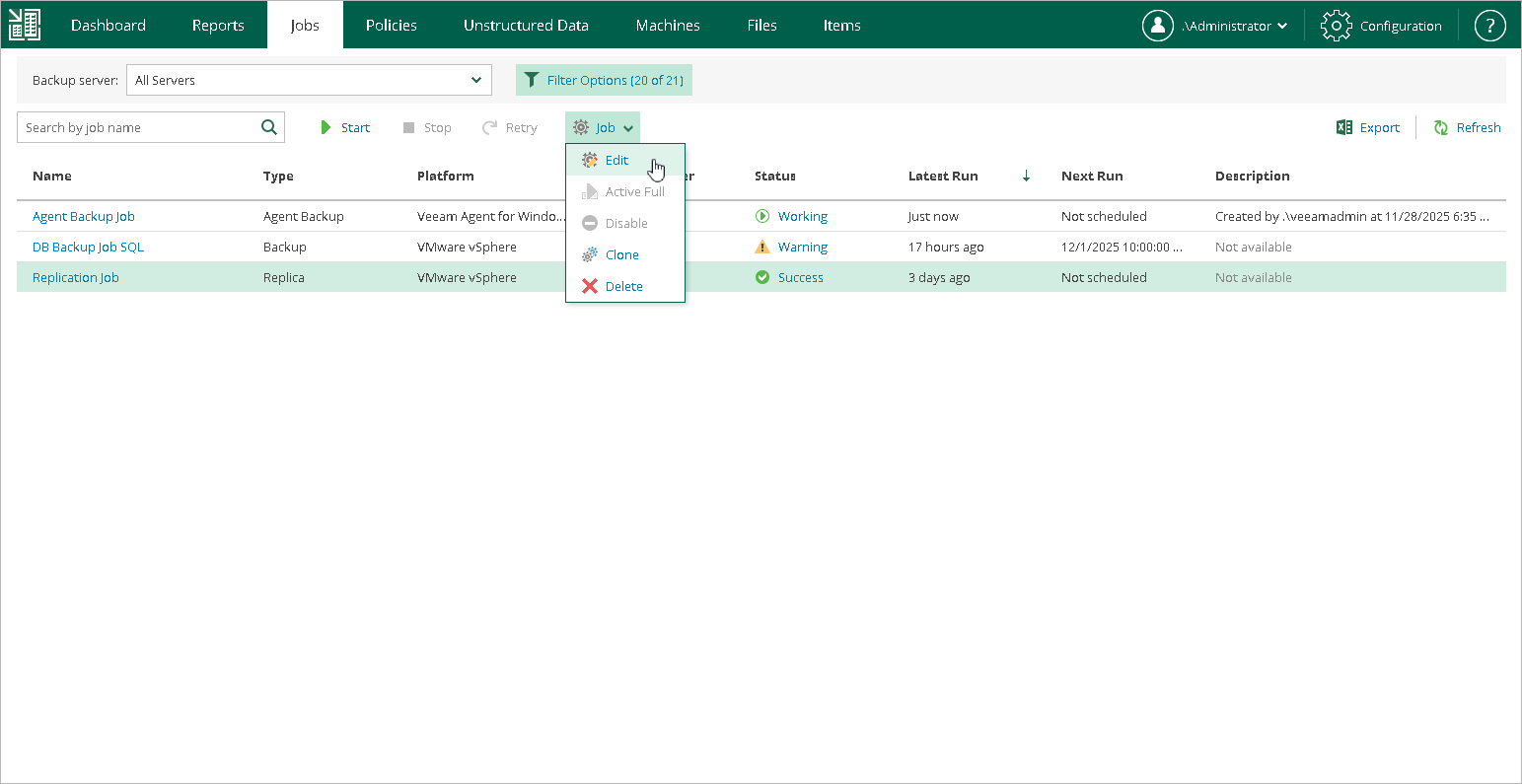 For more information on managing jobs, see the Managing Backup Jobs in Veeam Enterprise Manager section in the Veeam Backup Enterprise Manager Guide.