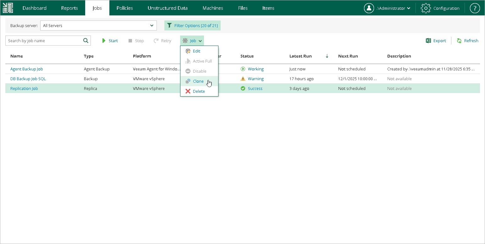 In this section, you will learn how to clone and then edit jobs. When you clone a job, you create its exact copy. Configuration details of the created job copy are written to the same Microsoft SQL database where details of the original job are stored. You can work with the created job both in Veeam Backup Enterprise Manager and in the Veeam Backup & Replication console on the backup server.
