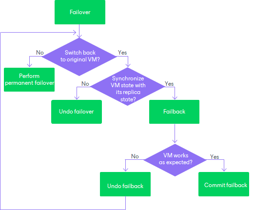 When you perform failover, you permanently switch from the original VM to a VM replica and use this replica as the original VM. This scenario is acceptable if the original VM and VM replica are located in the same site and are nearly equal in terms of resources.