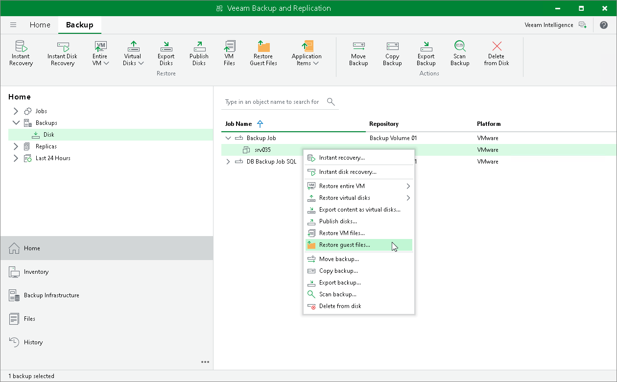 - In the inventory pane, select the Backups > Disk node. Expand a backup job in the working area, right-click a VM and choose Restore guest files > Microsoft Windows to launch the File Level Restore wizard.