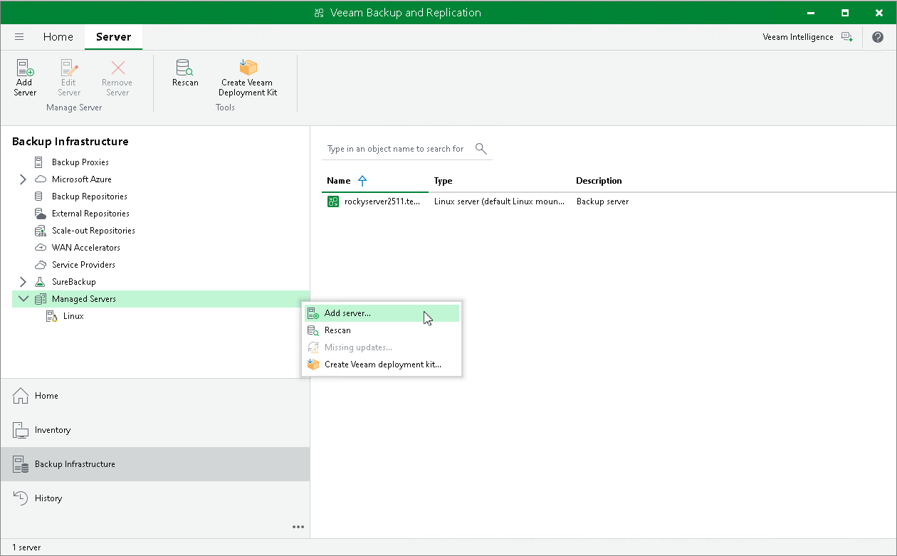 - In the inventory pane of the Backup Infrastructure view, right-click the Managed Servers node and select Add Server.