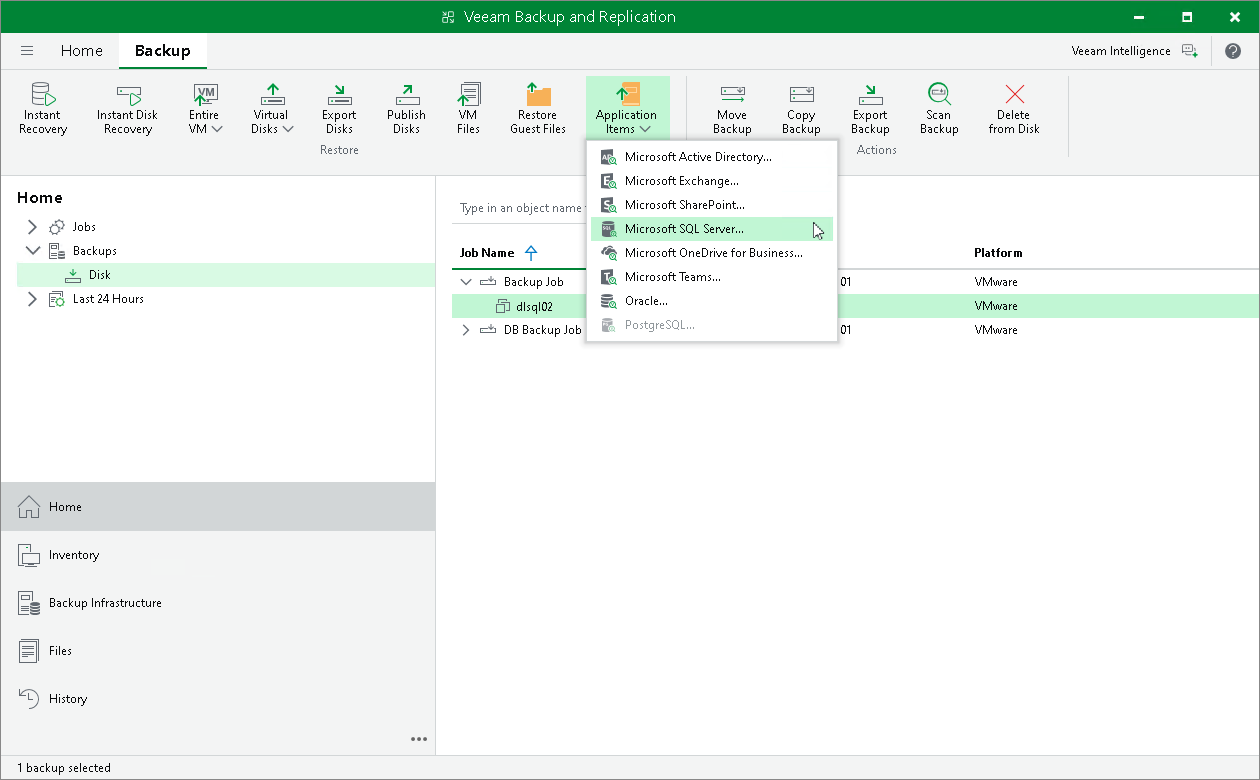 - In the working area, expand the backup job that processes the VM with Microsoft SQL Server. Select the VM and click Restore application items > Microsoft SQL Server databases on the ribbon to open the Microsoft SQL Server Database Restore wizard.
