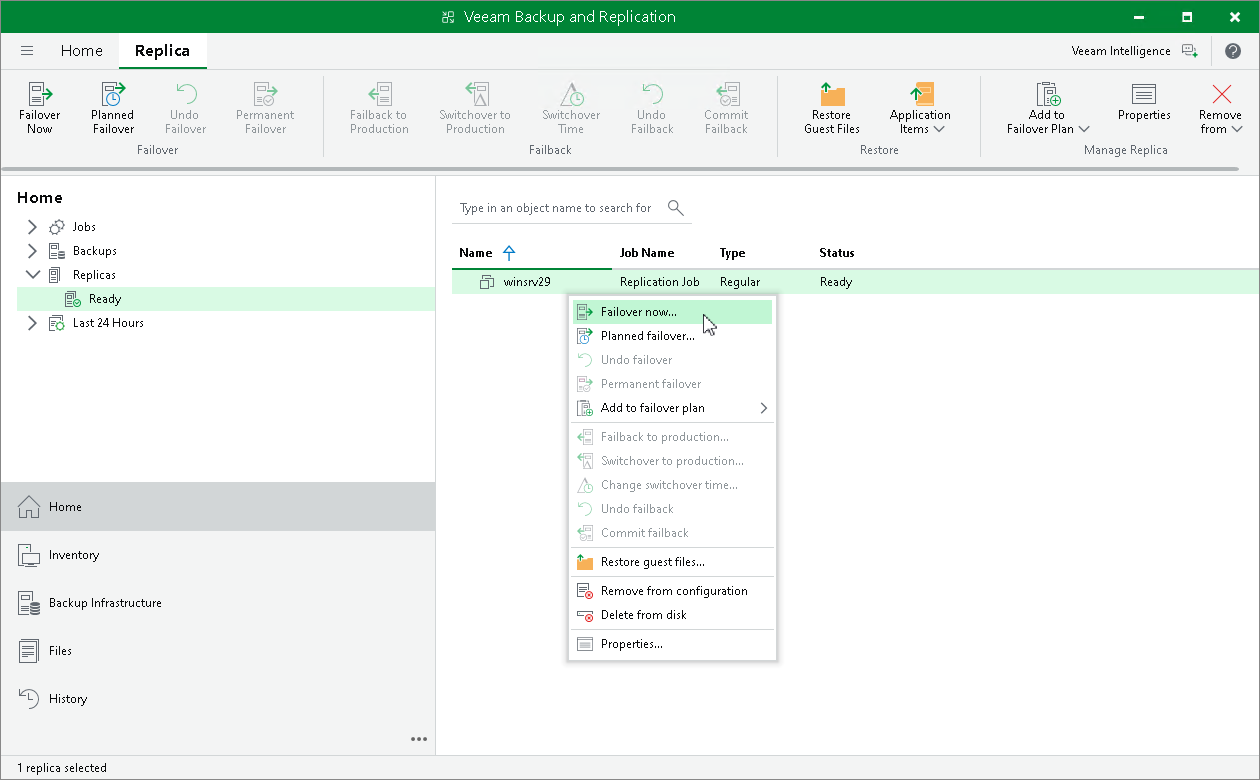 For more information on failover, see the Replica Failover (VMware vSphere) and Replica Failover (Microsoft Hyper-V) sections in the Veeam Backup & Replication User Guide.