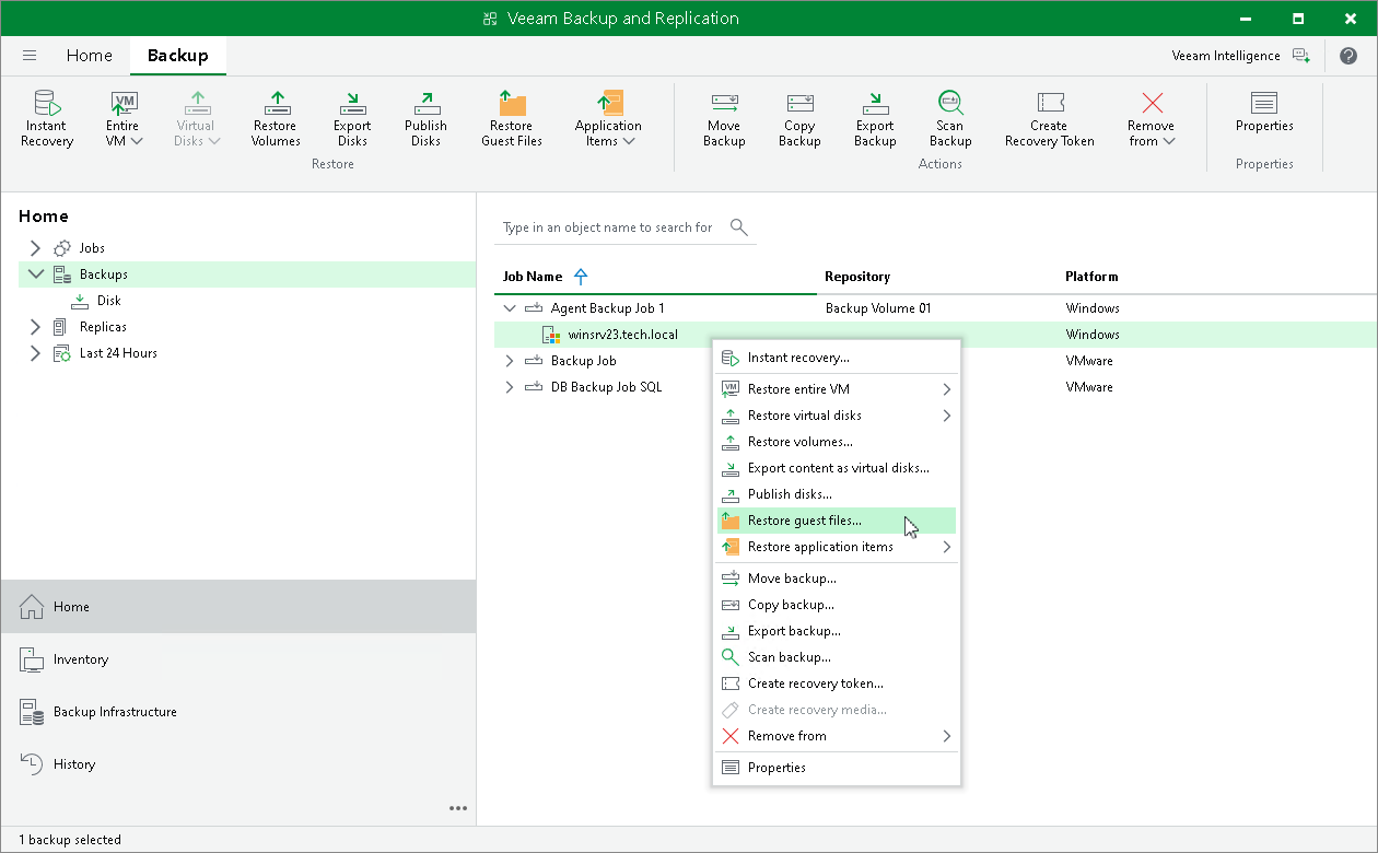 For the full list, see the Restoring Data from Veeam Agent Backups section in the Veeam Backup & Replication User Guide.