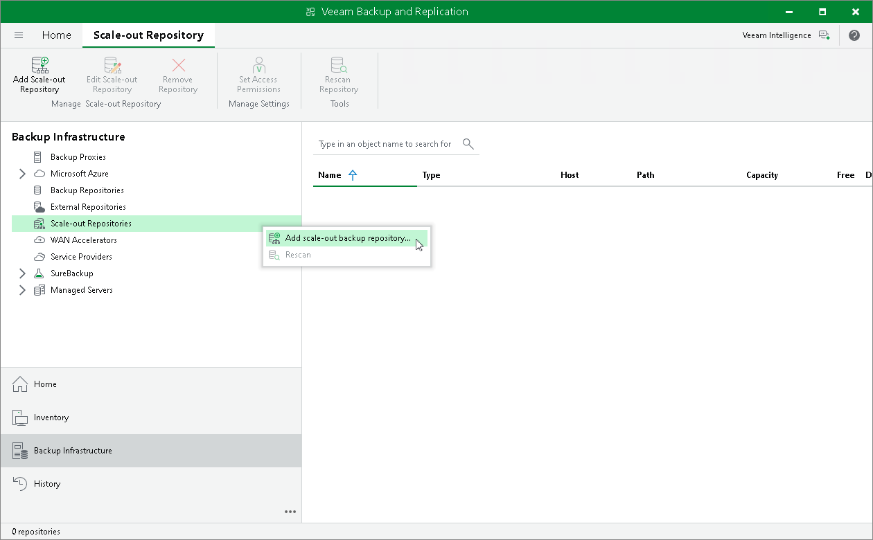 - In the inventory pane, right-click Scale-out Repositories and select Add Scale-out Backup Repository.