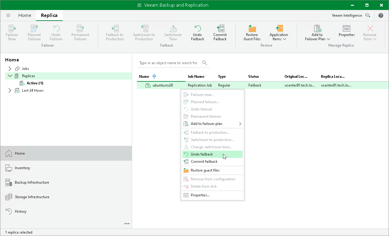 - In the working area, right-click the VM replica and select Undo Failback.