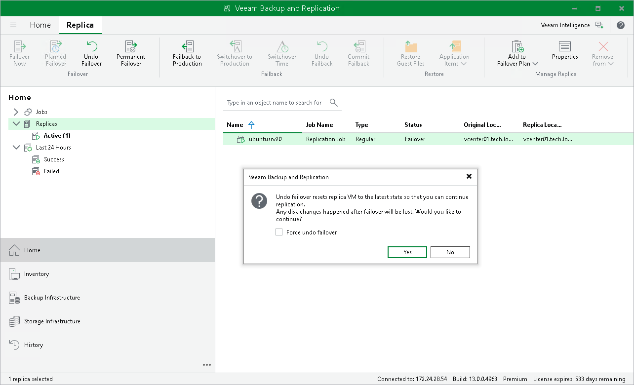 For more information on undoing failover, see the Undo Failover (VMware vSphere) and Undo Failover (Microsoft Hyper-V) sections in the Veeam Backup & Replication User Guide.