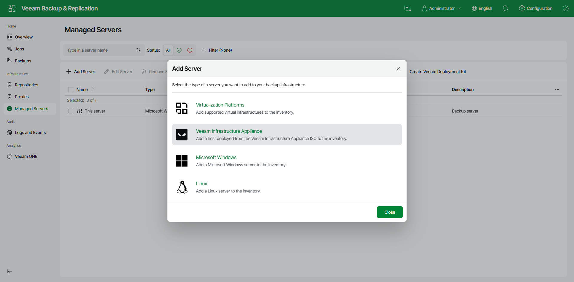 Step 1. Launch New Linux Server Wizard To launch the New Linux Server wizard, do the following:In the management pane, click the Managed Servers node.Click Add Server on the ribbon and select Veeam Infrastructure Appliance.