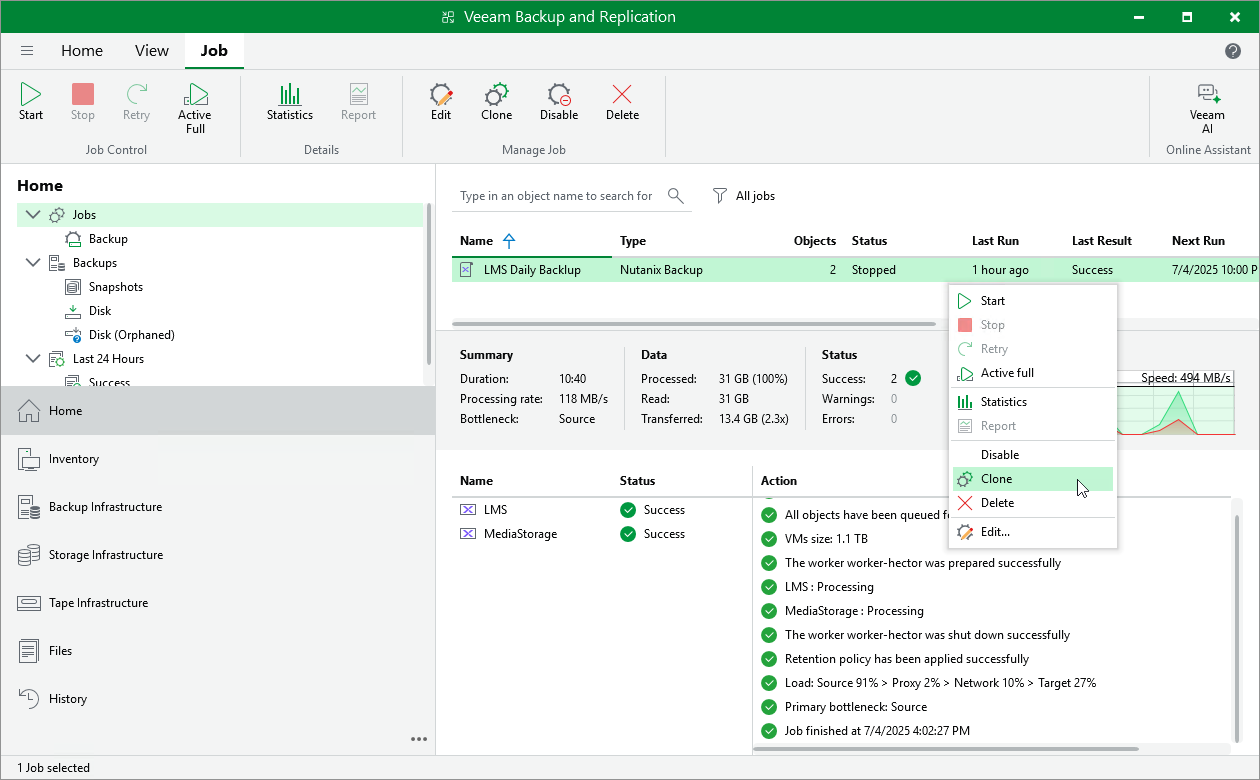 If the original job is scheduled to run automatically, Veeam Backup & Replication disables the cloned job. To enable the cloned job, select it in the job list and click Enable. |