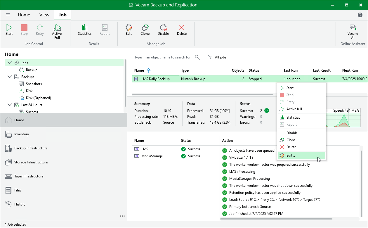 - To change the backup repository where backups are stored, to configure backup job retention settings, to schedule active and synthetic full backups, to configure health checks and email notifications, follow the instructions provided in section Creating Backup Jobs (step 4).