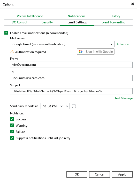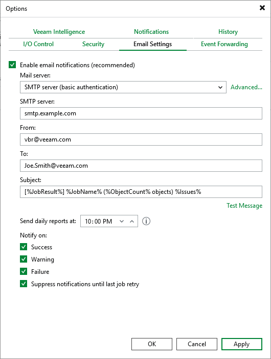 Veeam Backup & Replication allows you to send a test message to check whether you have configured the settings correctly. To do that, click Test Message. A test message will be sent to the specified email address. |