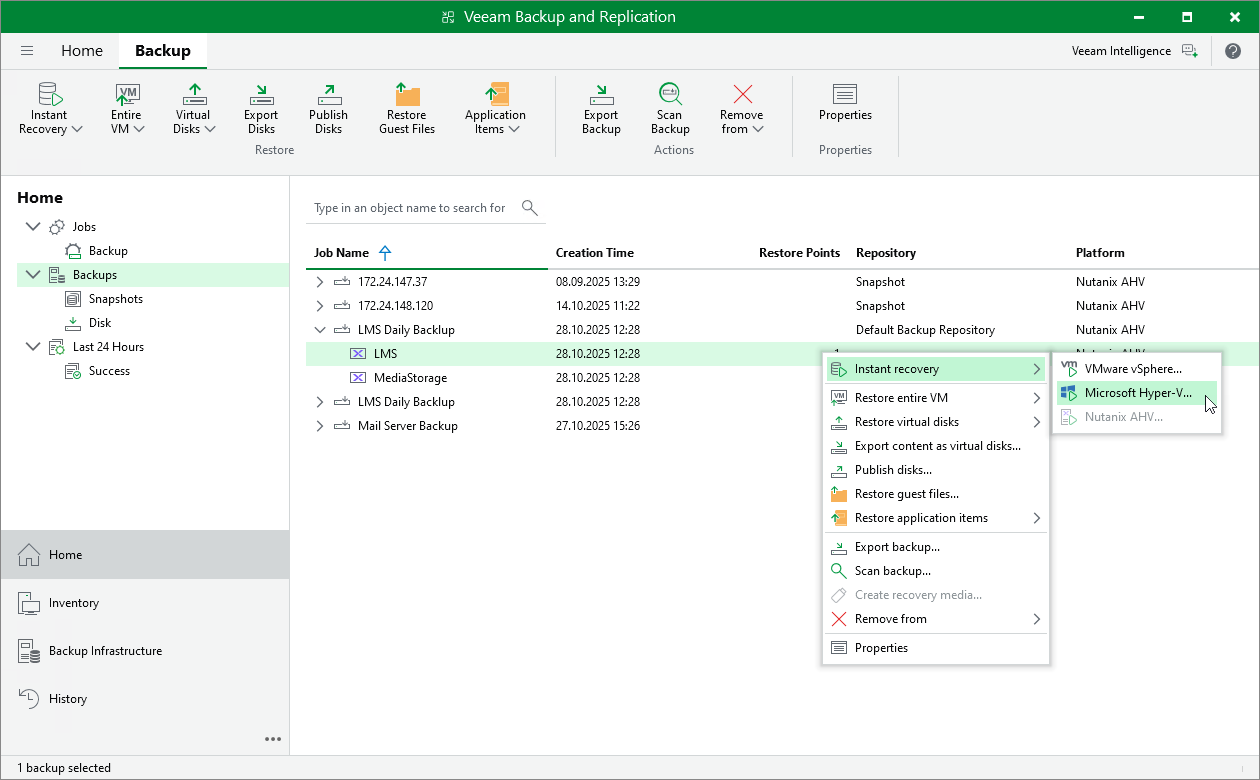 Performing Instant Recovery of Workloads to Hyper-V