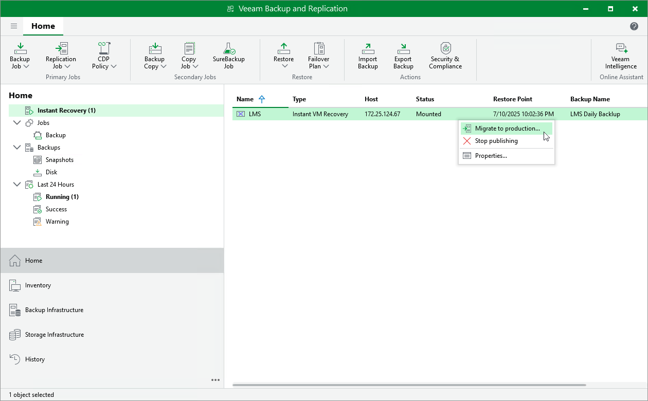 - To transfer VM disk data to the production storage, select Migrate to production.