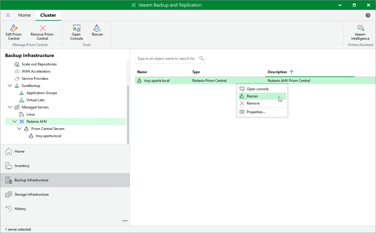 Veeam Backup & Replication retrieves information about the Nutanix AHV resources from the Prism Central or cluster. However, the data synchronization process may take some time to complete. If you make any changes to the Nutanix AHV environment and want both the Veeam Backup & Replication console to display the changes immediately, you can rescan the Prism Central or cluster manually.