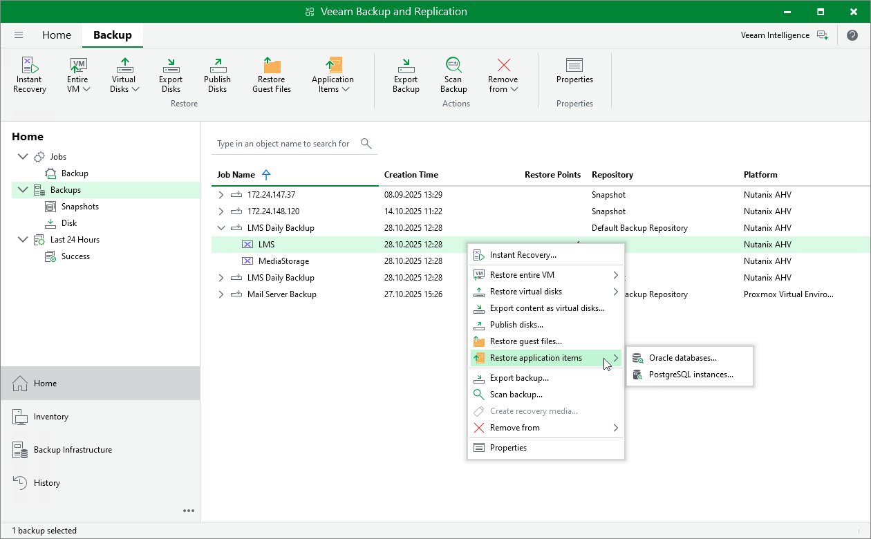 - In the working area, expand the necessary backup job, right-click the VM that contains an application you want to restore, select Restore application items and select the application.