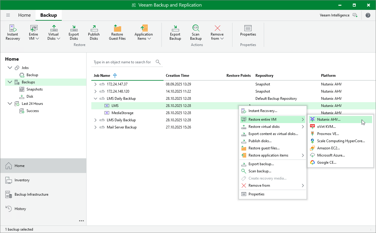 Alternatively, expand the necessary backup job, select the VM and click Entire VM > Nutanix AHV on the ribbon.