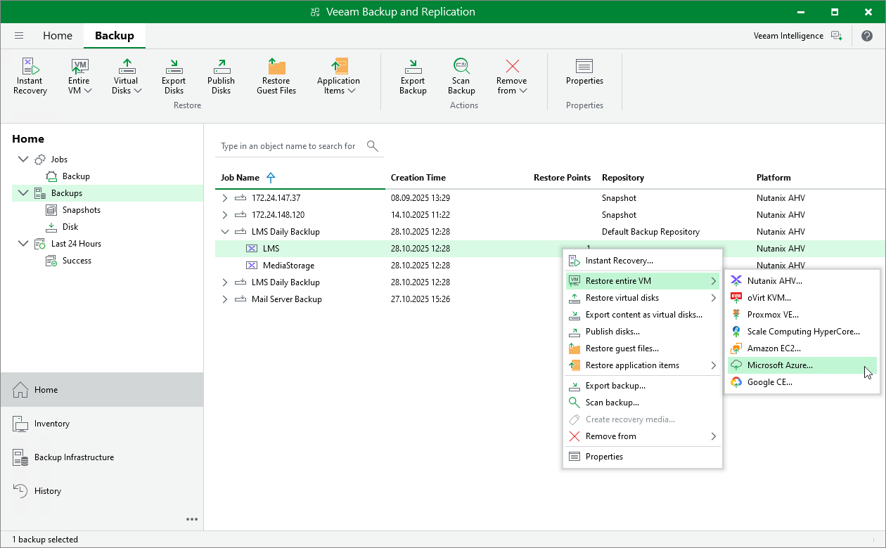 Alternatively, expand the necessary backup job, select the VM and click Entire VM > Microsoft Azure on the ribbon.