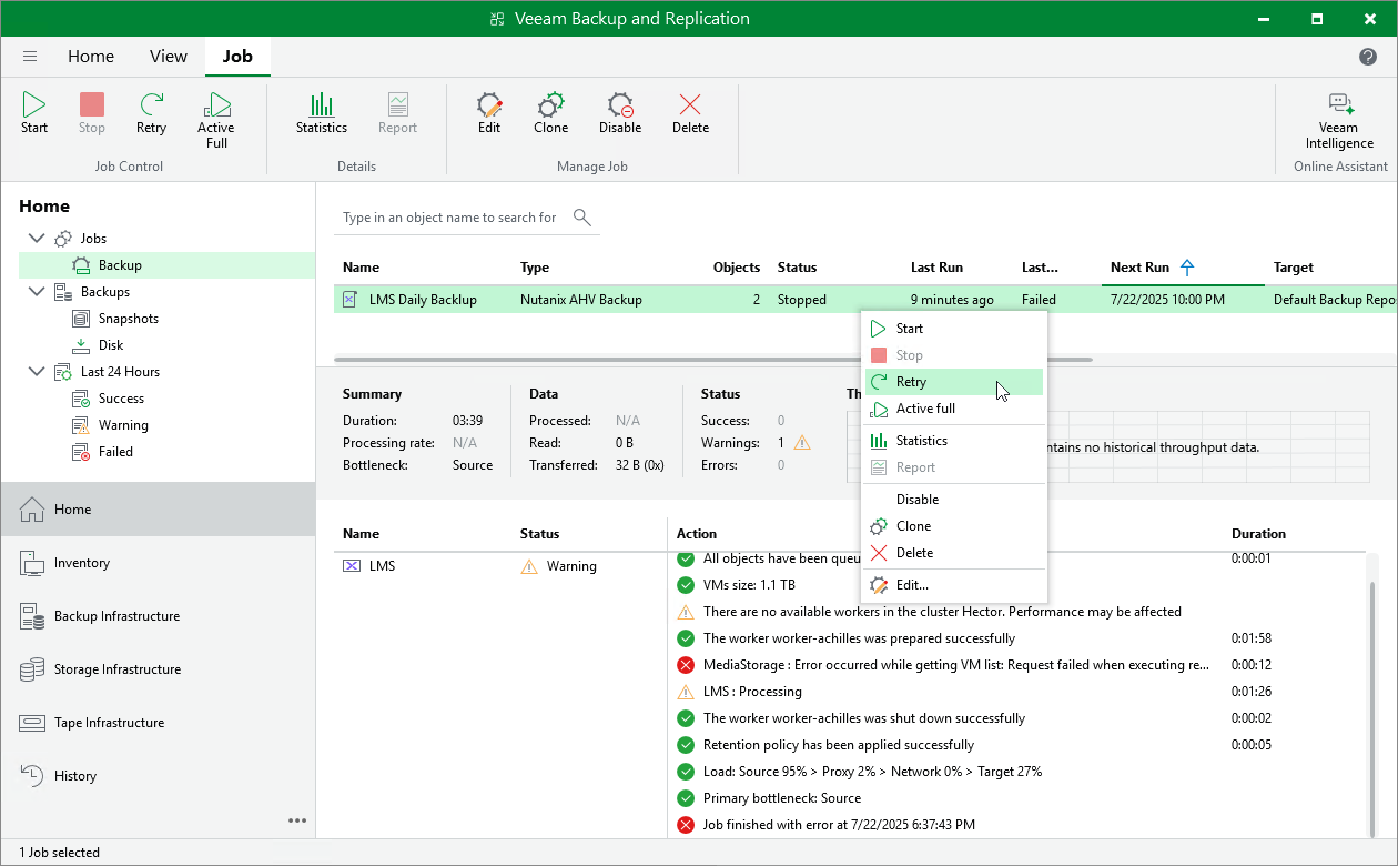If a job fails, you can retry the backup operation. When you perform a retry, Veeam Backup & Replication restarts the operation only for the failed resources added to the job and does not process VMs that have been processed successfully. As a result, retrying a job takes less time compared to restarting the job for all resources.