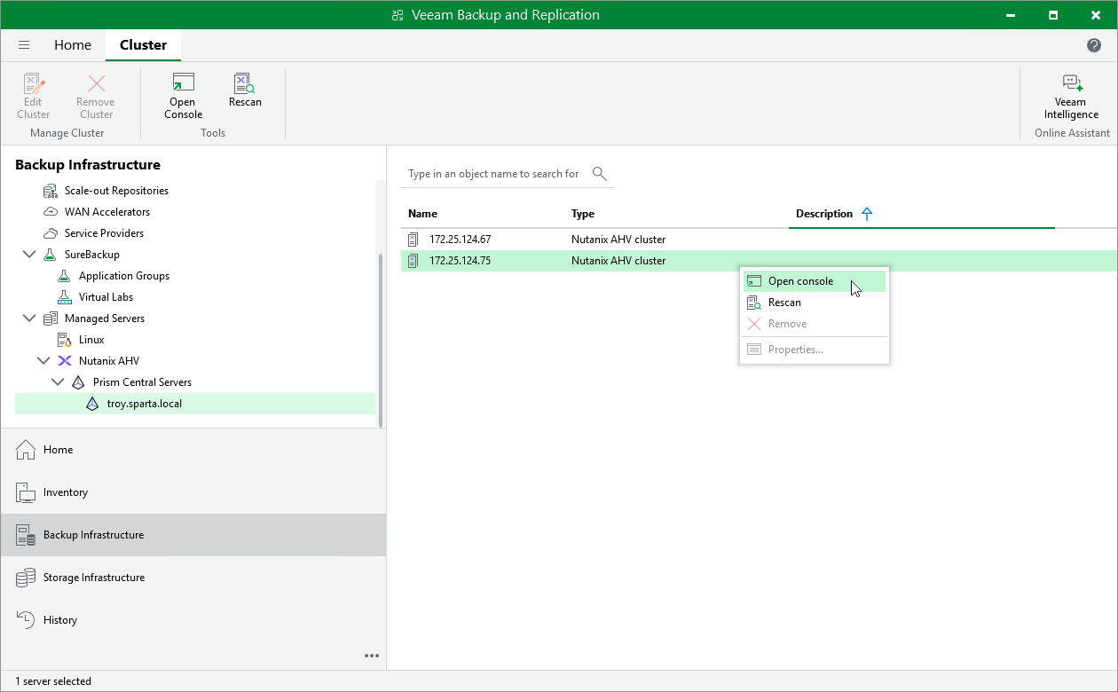 If you want to check the configuration of your Nutanix AHV infrastructure, you can use Veeam Backup & Replication to launch the Prism Central console or the Prism Element console.