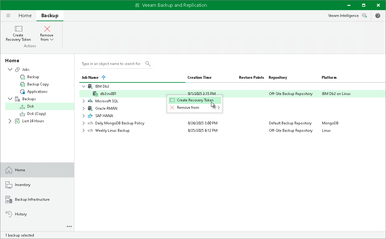 - In the working area, right-click the backup and select Create Recovery Token.