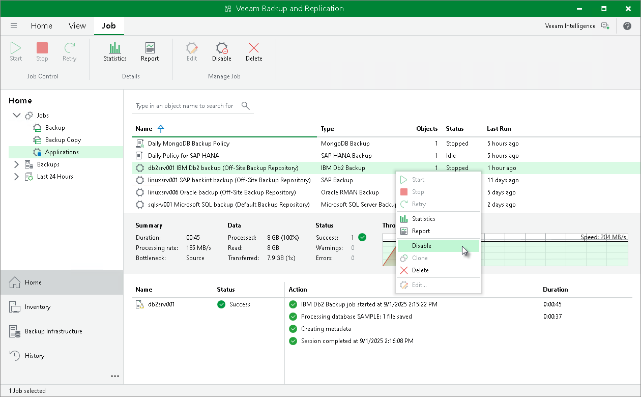 - In the working area, select the necessary job and click Disable on the ribbon. You can also right-click the job and select Disable.