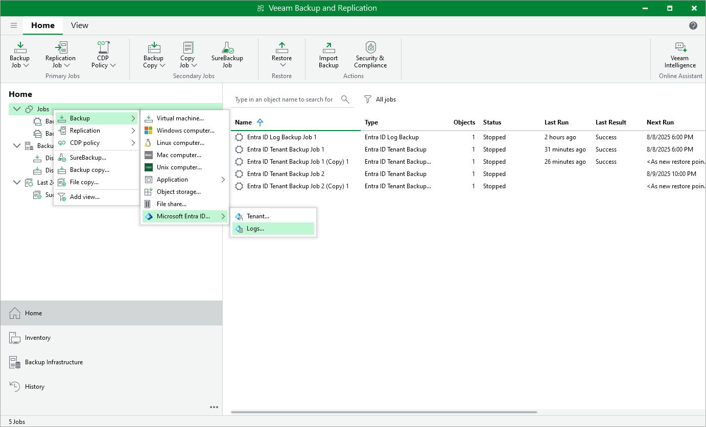 Step 1. Launch New Microsoft Entra ID Log Backup Job Wizard To launch the Microsoft Entra ID Log Backup Job wizard, do either of the following:Open the Home view. On the ribbon, click Backup Job > Microsoft Entra ID > Logs.Open the Home view. In the inventory pane, right-click Jobs and select Backup > Microsoft Entra ID > Logs.