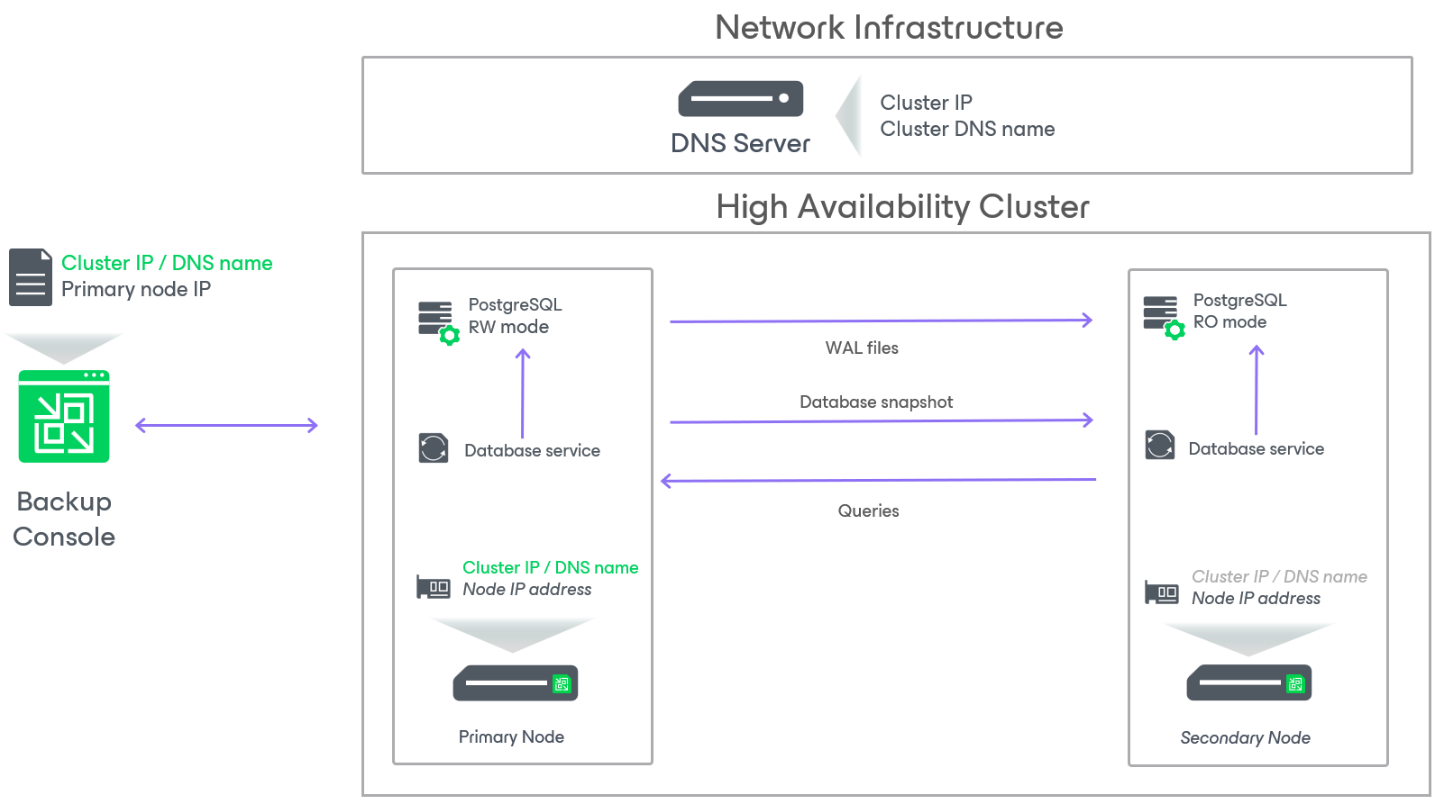 To synchronize data between the HA cluster nodes, Veeam Backup & Replication utilizes PostgreSQL database capabilities and leverages the database service that provides information on which node is primary and which node is secondary. Veeam Backup & Replication applies the streaming replication to synchronize the HA nodes: data is always written to the primary node, while the secondary node serves as a replica. The database service takes control of the primary and secondary node and initiates data synchronization between their databases.