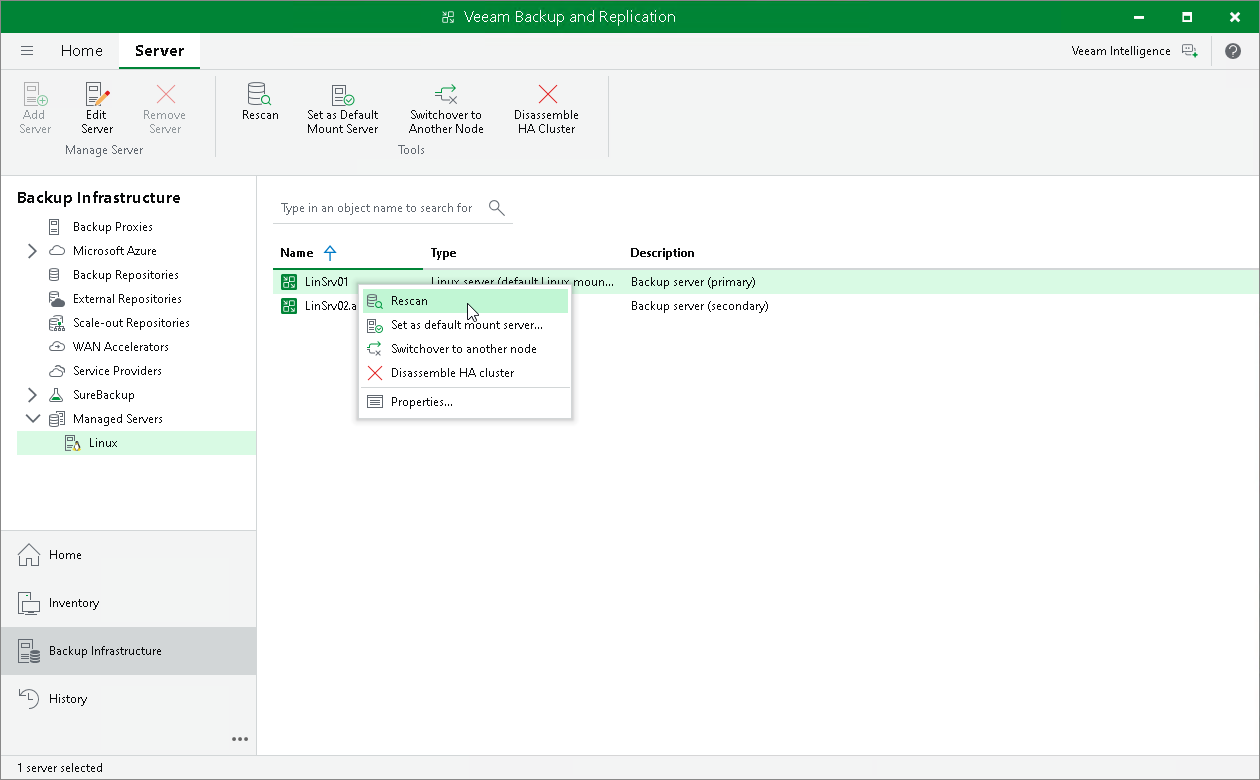 - In the working area, select the primary node of your HA cluster and click Rescan on the ribbon. Alternatively, you can right-click the primary node and select Rescan.