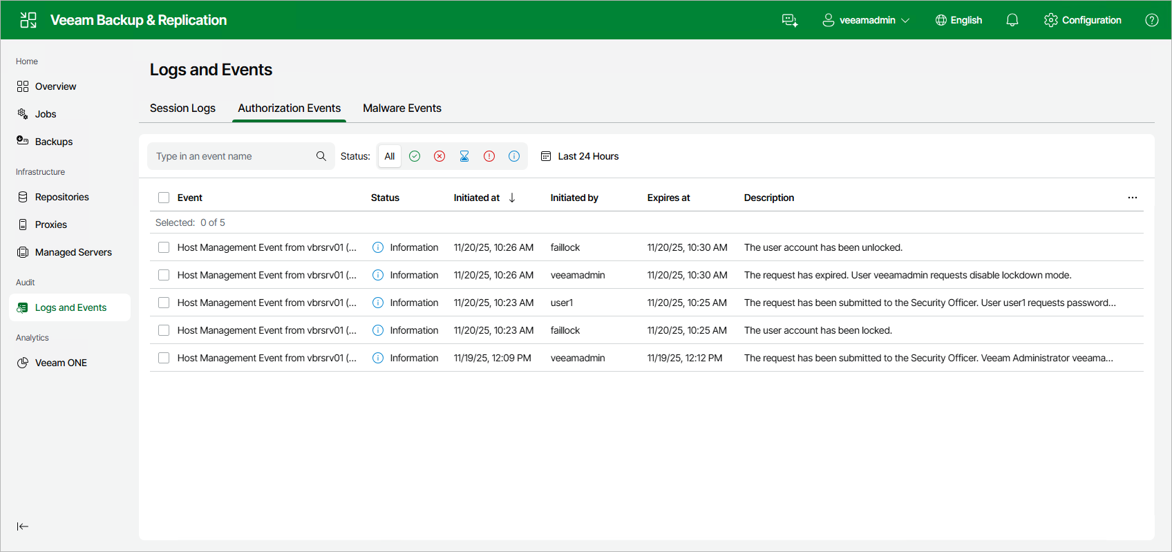 To view authorization request events in the Veeam Backup & Replication desktop application, perform the following steps: